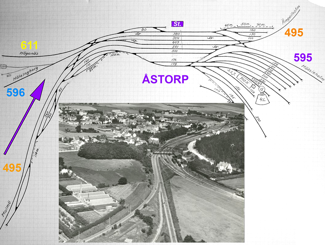 Bilden över Åstorp stämmer ganska väl med skissen. Nedtill, vänster i bild går spåren mot Höganäs och Hälsingborg. Ut till höger syns spåret mot Malmö. Bangårdsskiss: ekeving.se Bilden: Åstorp 1933 , KCAC06603 Järnvägsmuseet.